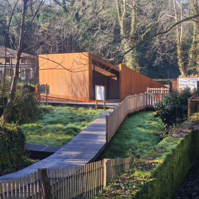 Dans le cadre de ce projet, plusieurs aménagements ont été réalisés pour accueillir les visiteurs et faciliter la découverte du site historique. Les constructions en bois réalisées sur place s’intègrent naturellement dans le paysage landais et rappellent l’architecture traditionnelle de la région.