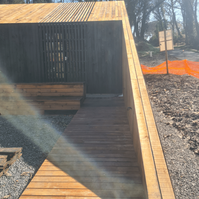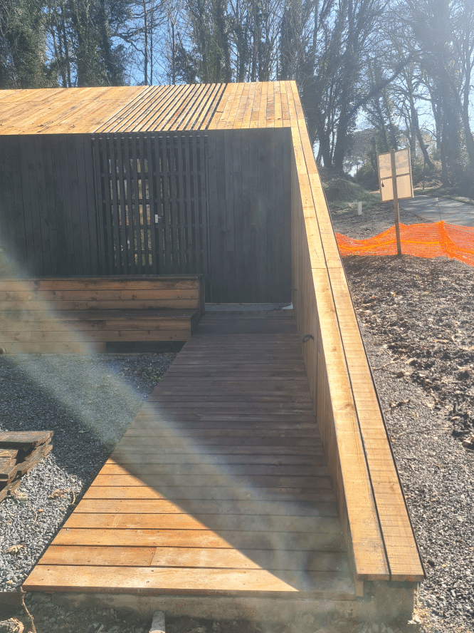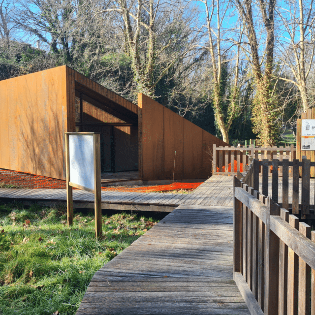 Dans le cadre de ce projet, plusieurs aménagements ont été réalisés pour accueillir les visiteurs et faciliter la découverte du site historique. Les constructions en bois réalisées sur place s’intègrent naturellement dans le paysage landais et rappellent l’architecture traditionnelle de la région.